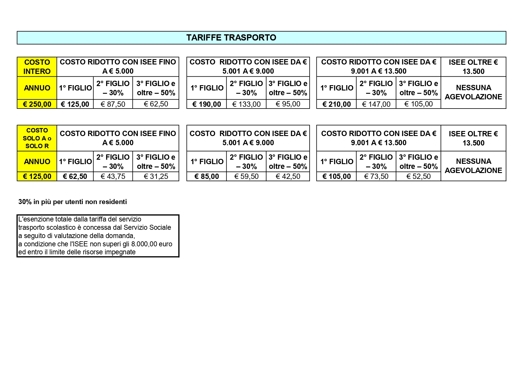 Le eventuali esenzioni dal pagamento di tale servizio saranno valutate dall’Ufficio Servizi Sociali.